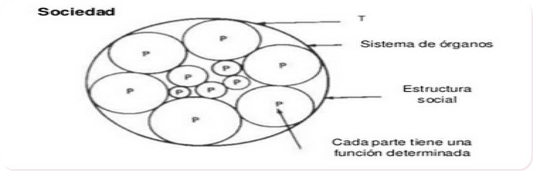 Durkheim considera que las sociedades estan compuestas de partes conjuntadas, las unas con las otras, formando un sistema de órganos que forman a la vez una estructura social.